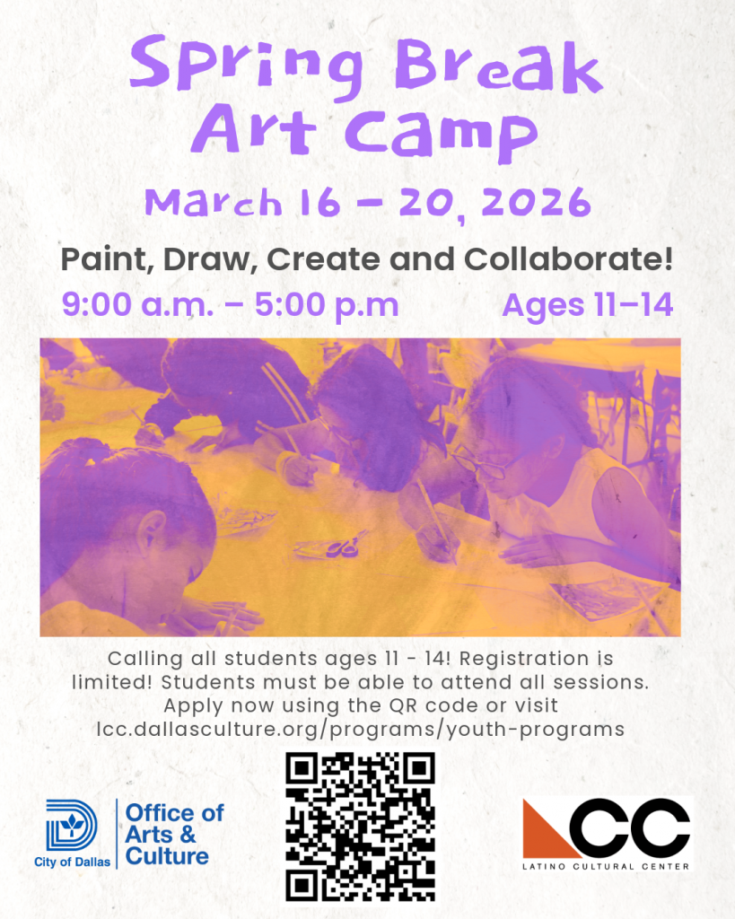 Spring Break Art Camp at the Latino Cultural Center is gearing back up for 2026. Students and young artists can explore their creativity through hands-on activities led by professional teaching artists. No art experience is required! The camp offers a fun and engaging way for youth to connect with Latino arts and culture. Follow the link to register and secure your spot today. March 16-20, 2026 Monday – Friday from 9:00 AM to 5:00 PM